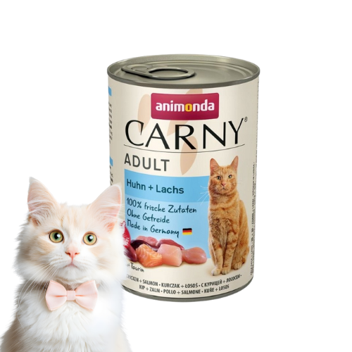 Animonda Carny Adult Kurczak z Łososiem 400g to karma mokra dla dorosłych kotów. Pełnowartościowy posiłek z wysoką zawartością mięsa i łososia, bez zbóż, wspierający zdrowie serca i układ pokarmowy.