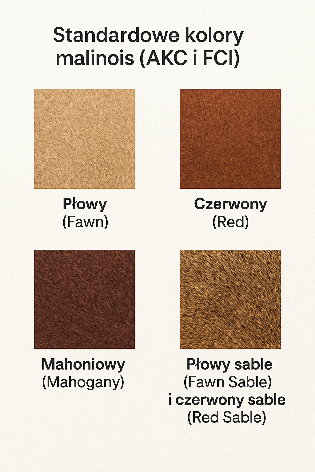Owczarek belgijski malinois charakteryzuje się krótką, gęstą sierścią, która może przybierać różne odcienie. Standardy rasy, takie jak te uznawane przez American Kennel Club (AKC) i Fédération Cynalogique Internationale (FCI), określają dopuszczalne kolory oraz wzory umaszczenia.