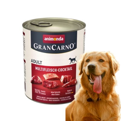 Animonda GranCarno Adult Multi Mix Mięsny Koktajl 800 g to kompletna mokra karma dla dorosłych psów (1–6 lat), z wysoką zawartością świeżego mięsa oraz bez zbóż, soi i sztucznych dodatków. Zachwyca intensywnym aromatem i czystym smakiem, który chętnie wybierają psy.