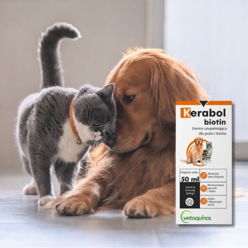 Vetoquinol Kerabol Biotin 50 ml to suplement diety dla psów i kotów, wspomagający zdrowie skóry i sierści. Zawiera biotynę, cynk, metioninę oraz witaminę A. Pomaga przy suchości skóry, łuszczeniu, nadmiernym linieniu oraz poprawia kondycję sierści i pazurów.